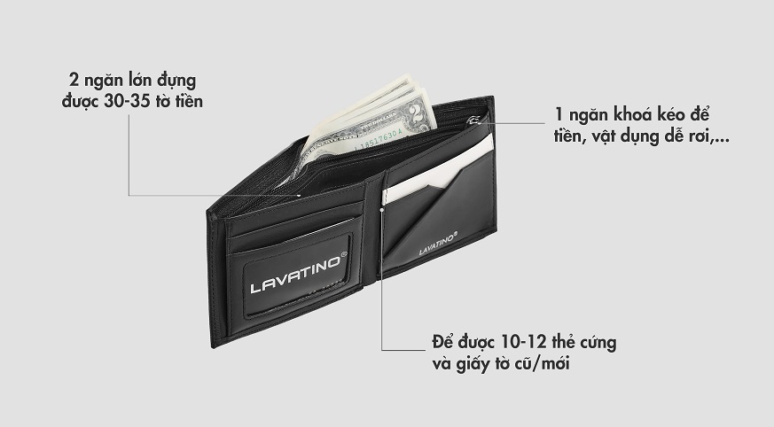 - 2 ngăn lớn đựng tiền, 1 ngăn đựng ảnh cùng 8 ngăn thẻ ATM/ CCCD/ giấy tờ xe loại cũ